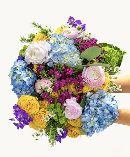 Bright and vibrant floral bouquet featuring hydrangeas, ranunculus, and colorful blooms.