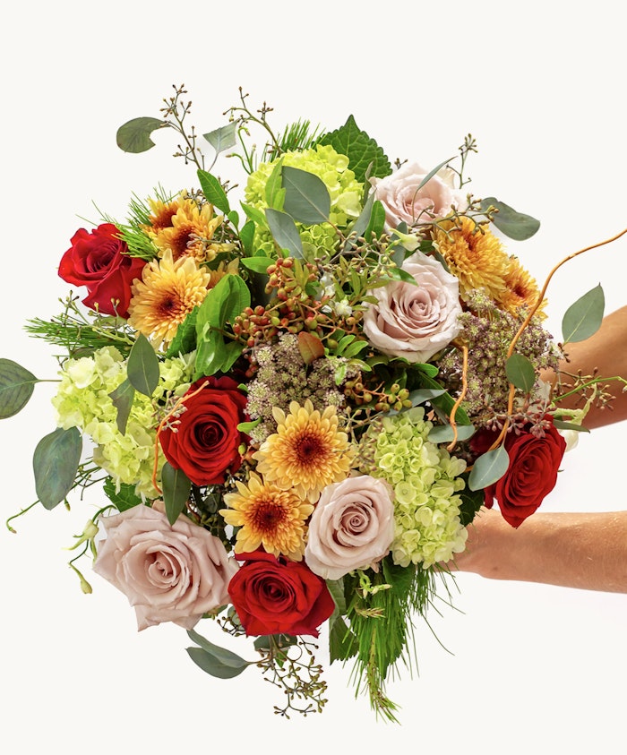 Indulge in the festive charm of a wintry city stroll with our Christmas in the City bouquet. Rich red roses are accented by the unique natural color of quicksand roses for a sophisticated flair, while pompon cushion blooms resemble the soft glow of city lights. Unique textural elements of mini hydrangea, queen anne’s lace, seeded eucalyptus, and curly willow combine to create a dazzling display at every turn.