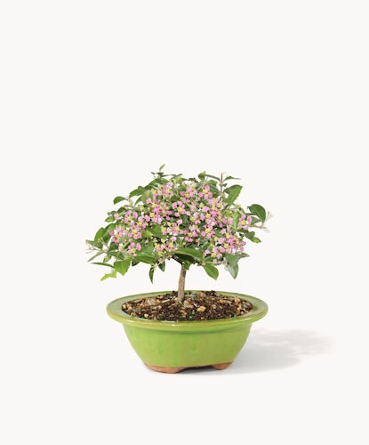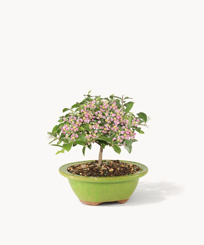 This Barbados Cherry has a small dark evergreen leaf. The extremely vibrant pink and yellow blooms appear between April and October. The growth habit of this bonsai makes it a fun trimming project that is easy to maintain. Water the soil of your bonsai properly by using a watering can or hose attachment that has a fine-spray end. You should thoroughly soak your bonsai’s soil. Water should be running out of the drain holes. You can also submerge the pot in standing water for a few minutes to fully saturate the soil. Aim to maintain even soil moisture. Misting foliage periodically is recommended but should not be considered watering. General care is also important to maintaining a beautiful bonsai. Bonsai should be periodically trimmed to keep their miniature shape. To best understand trimming and wiring techniques, we recommend purchasing an instructional book.