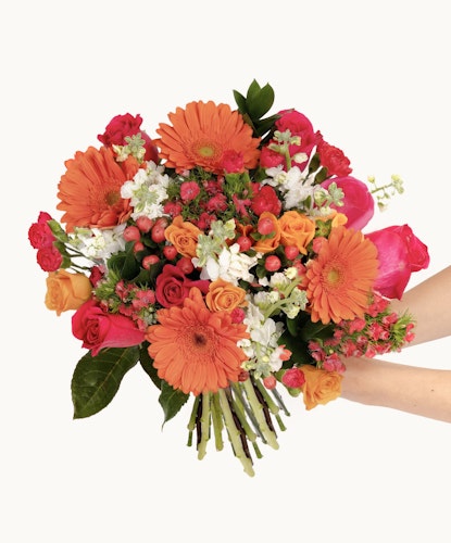 Billowing with vibrant blooms, our Full Bloom Bouquet showcases an exquisite array of springtime favorites. Vibrant orange gerberas, delicate spray roses, fragrant white stock, coral hypericum berries, hot pink roses, charming carnations, lush ruscus, and enchanting dianthus create a stunning arrangement teeming with life.