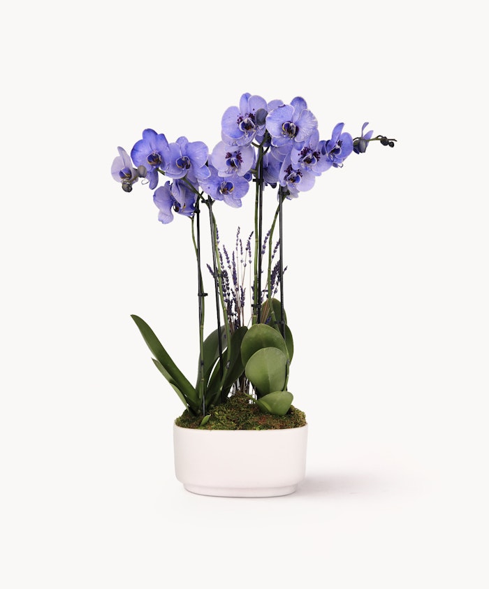 Sink into the calming nature of lavender with this luxurious 10” watercolor orchid duo and coordinating lavender stems. Nestled in a decorative ceramic pot with lush green moss, this beautiful plant is the gift that keeps on growing – no green thumb required!