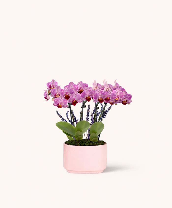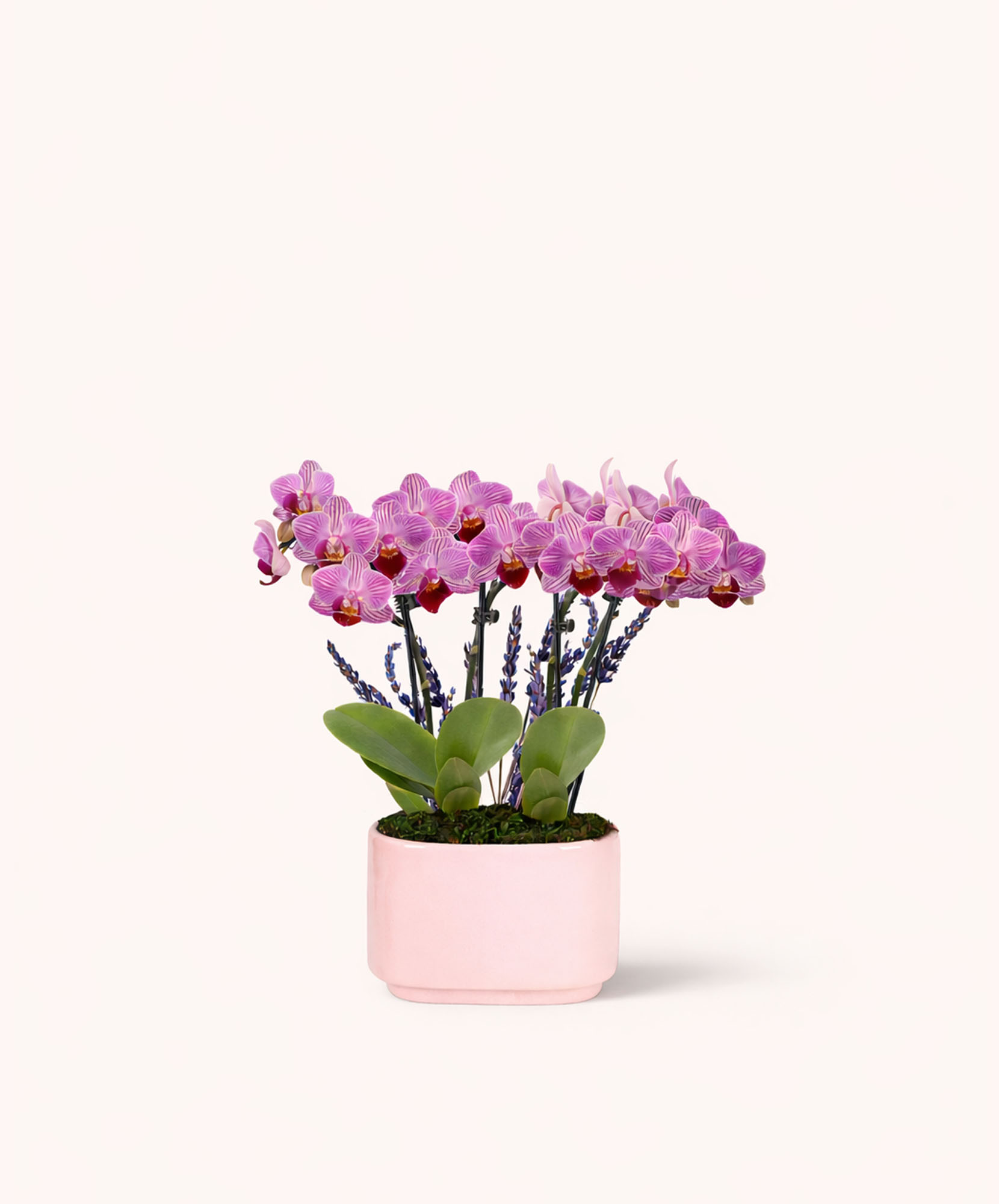 Pink orchid arrangement with lavender and lush green leaves in a stylish planter.