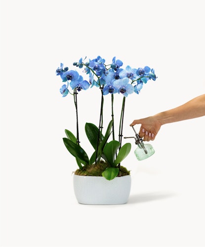 The orchids are dyed using a safe and natural patented method of injecting a specially formulated dye into the stem of the plants. Blooms typically last 8-12 weeks. Once the blooms fall off, it will rebloom with proper continued care in the plants original color, free of dye.